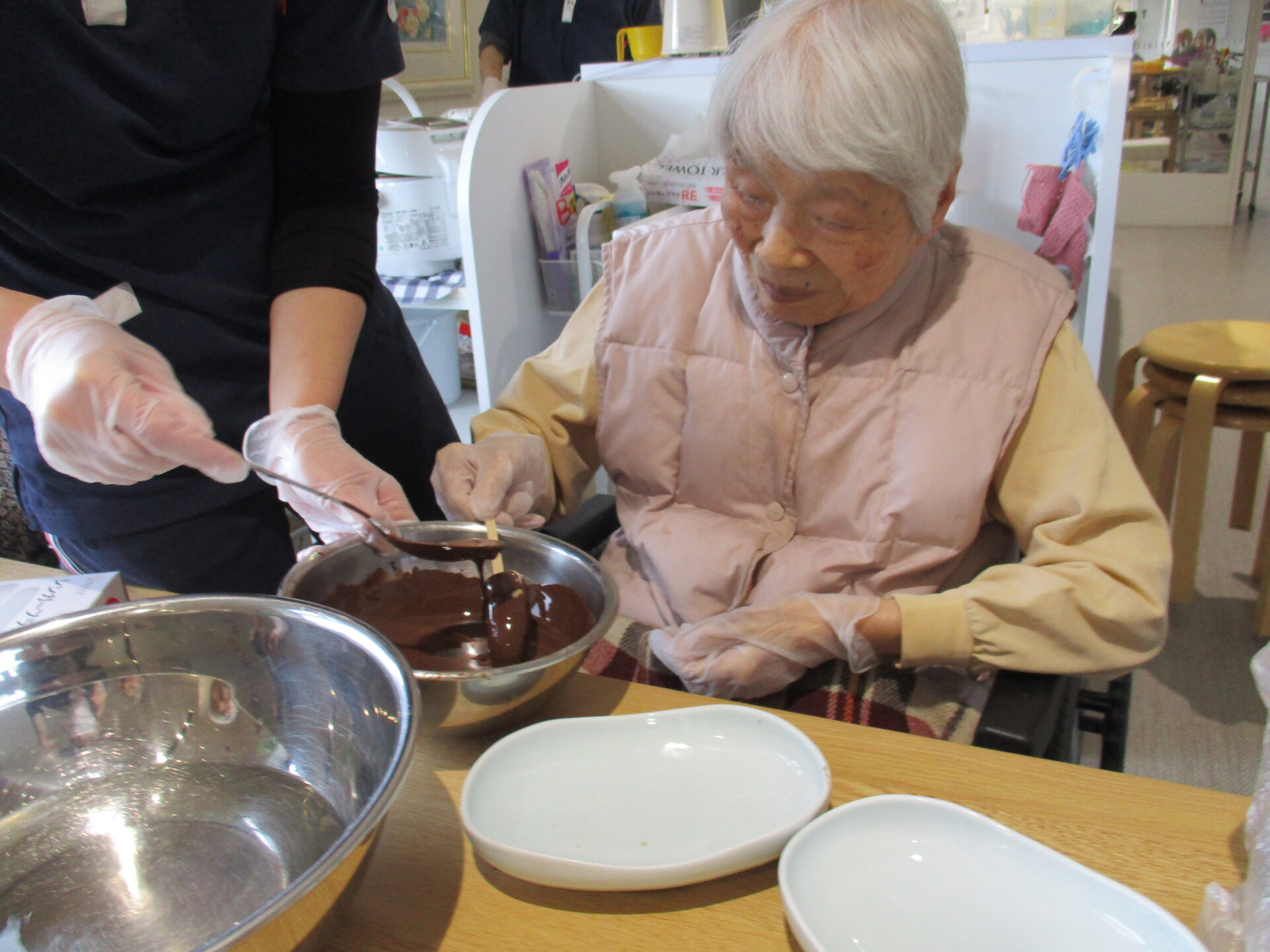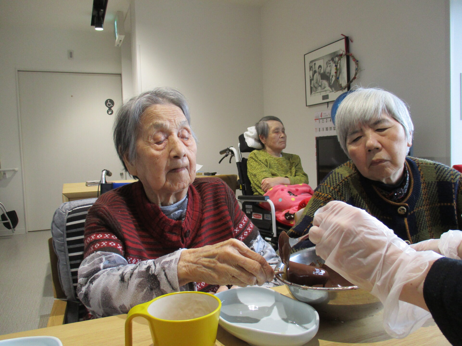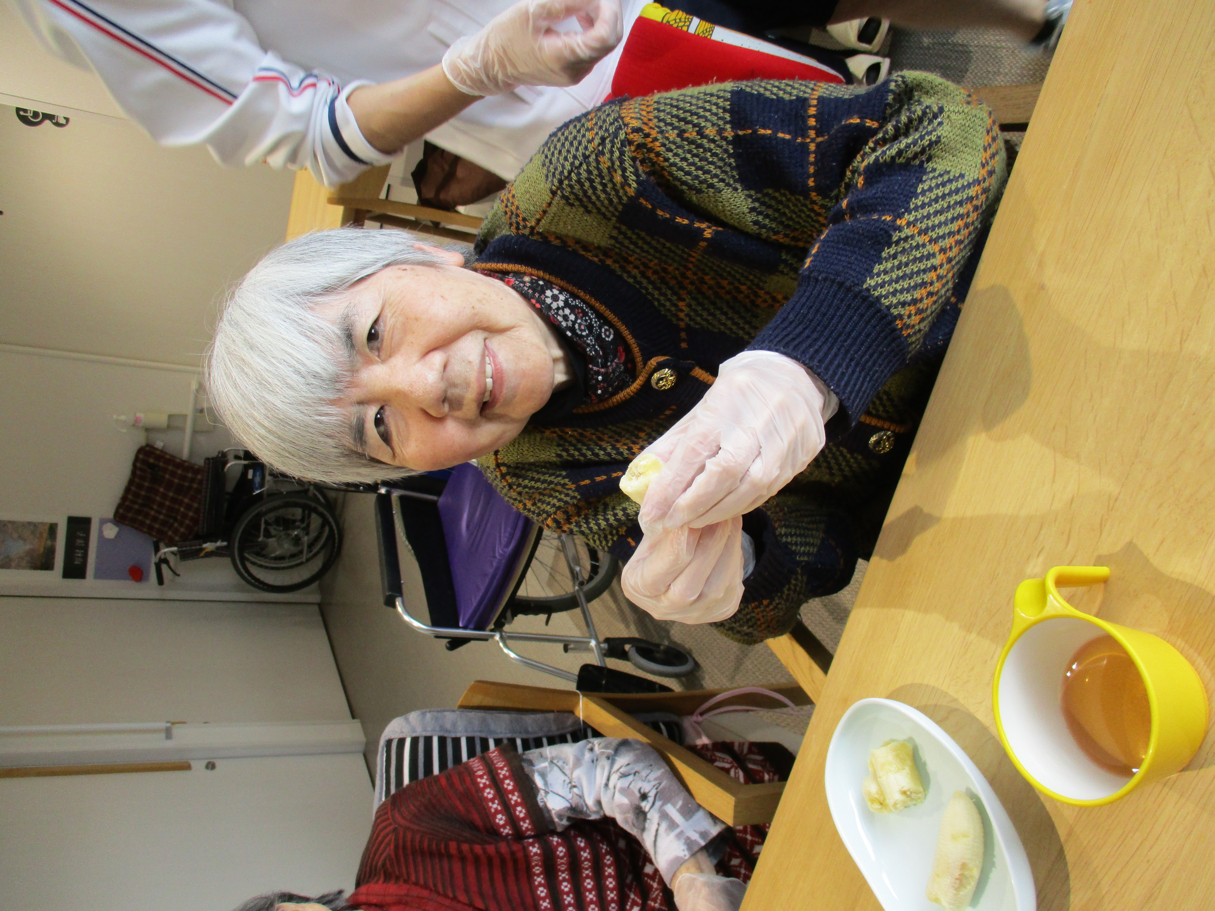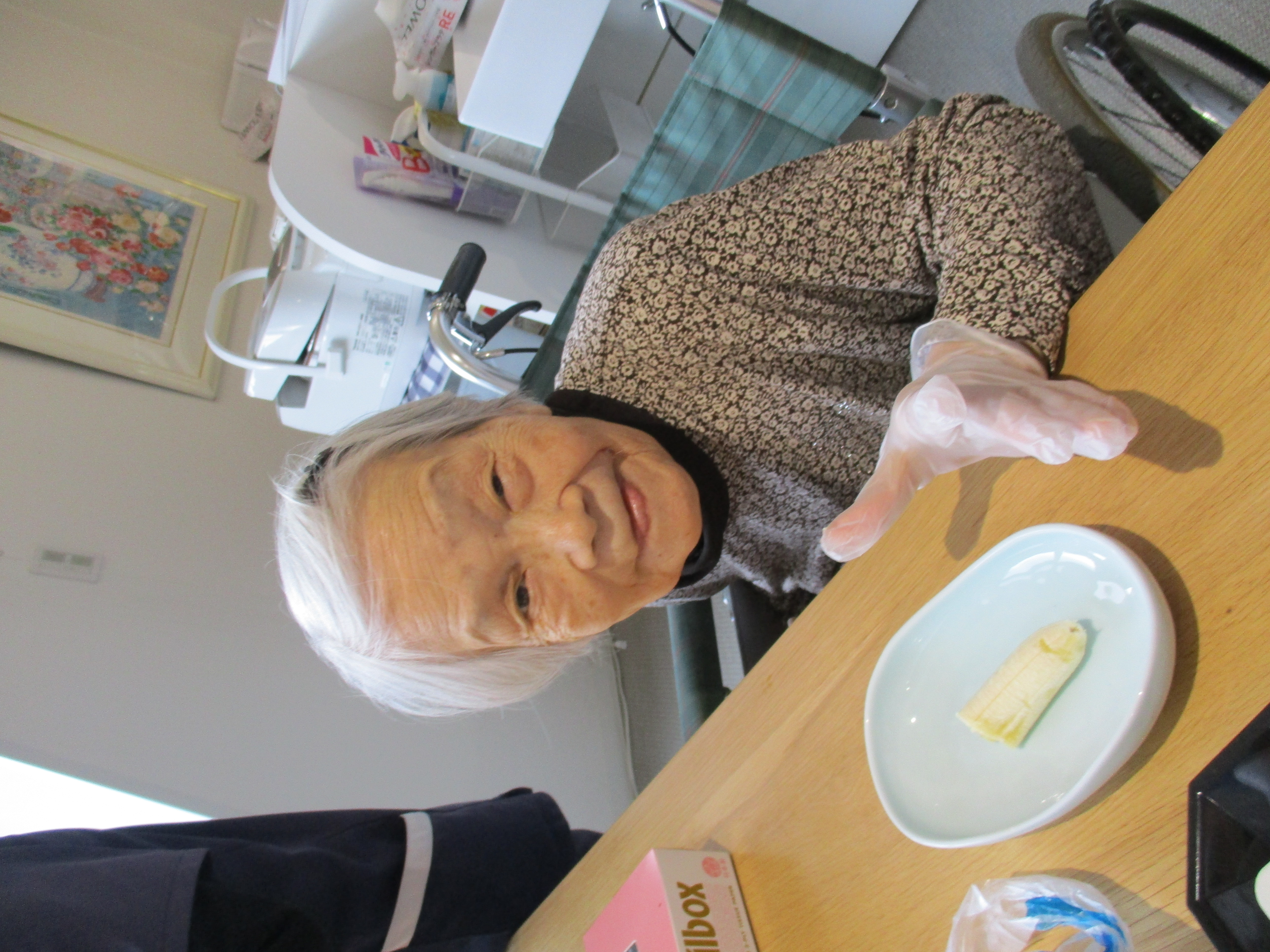 4月11日、Bユニットの利用者さまと「チョコバナナ」を作っておいしくいただきました。 まずはバナナの皮をむきます。 バナナが崩れないように、丁寧にスティックをさします。 チョコレートでコーティングしてカラースプレーをトッピングして出来上がりです! みなさま、「おいしいわね」「また作って食べたいね」と大好評でした。