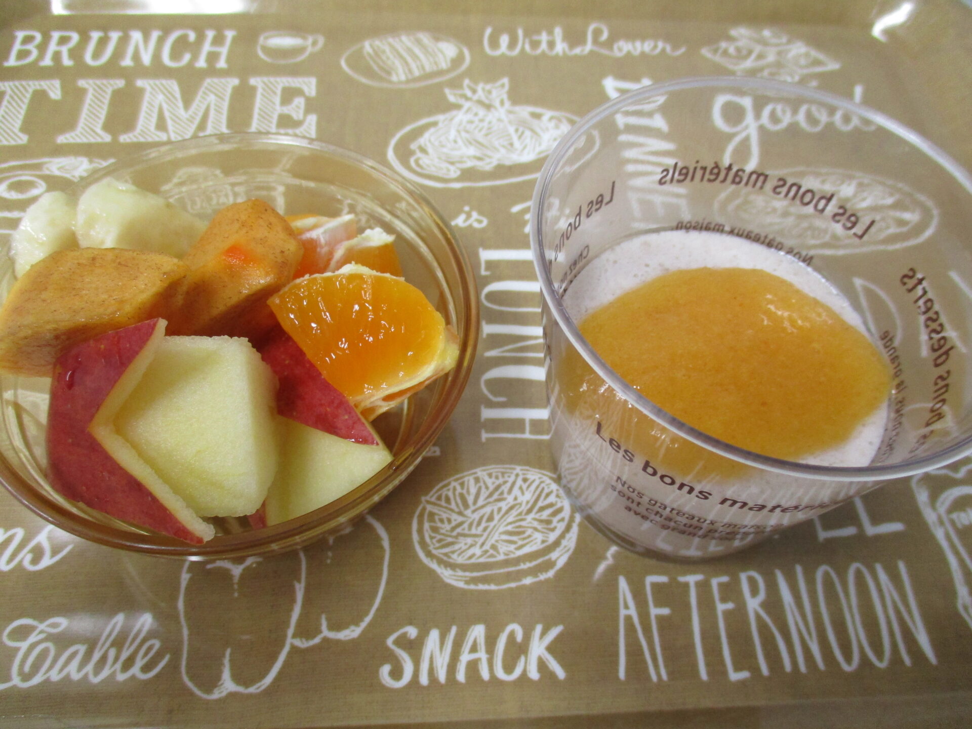 11月22日のおやつは、ご利用者様のリクエストにお答えし、「季節のフルーツの盛り合わせ」と、嚥下困難な方でも安全にお召し上がり頂ける「ばななプリン フルーツジュレ添え」を提供しました。