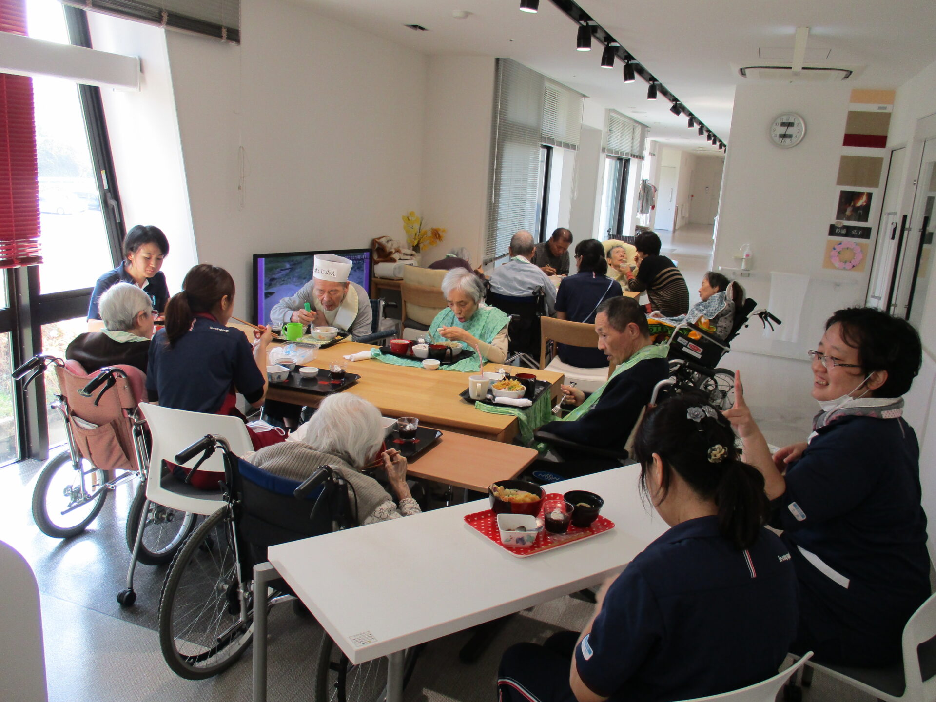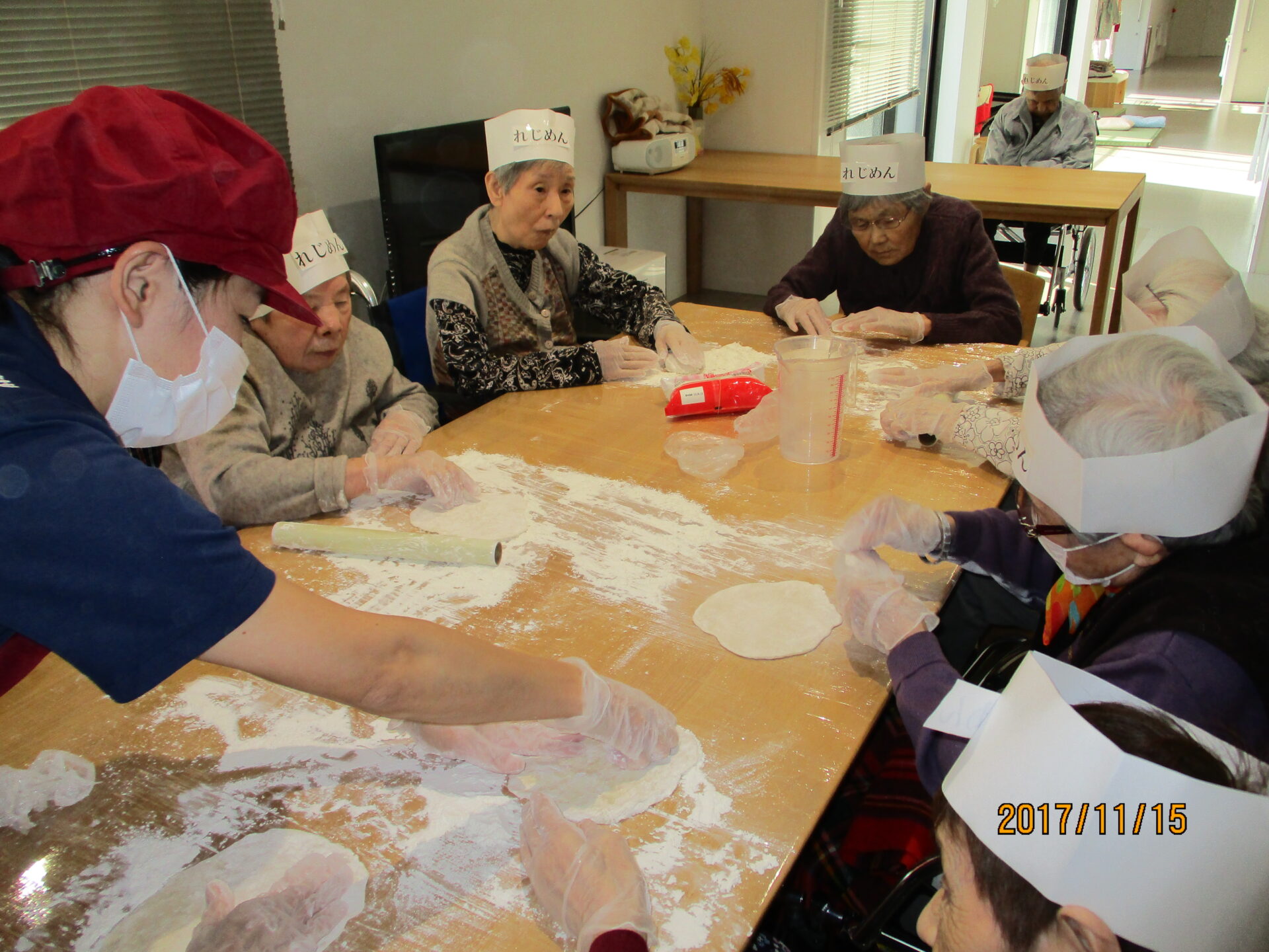 ご利用者様、職員共に、「れじうどん」の帽子をかぶり、準備完了!