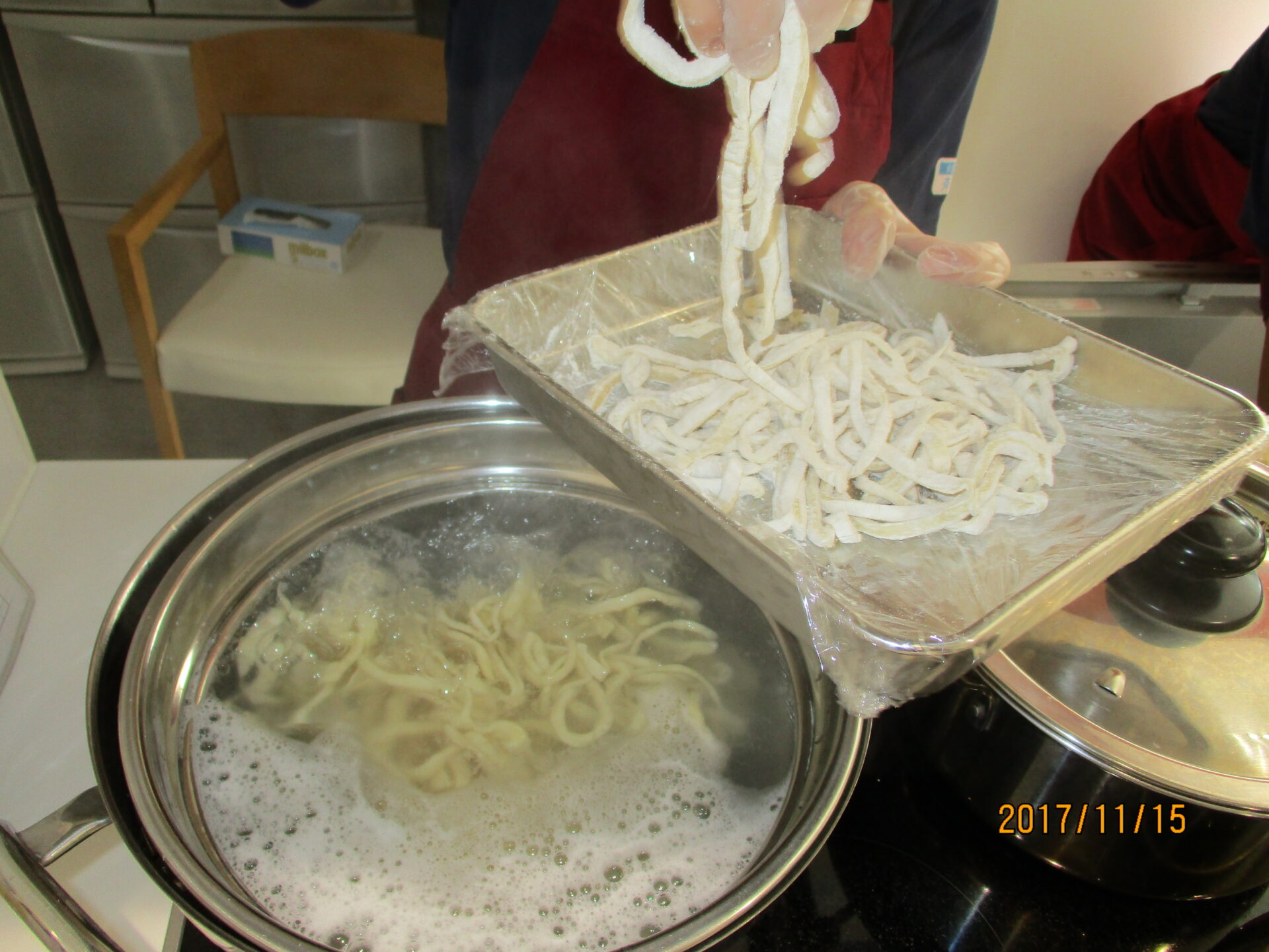 皆様に作っていただいた麺を、たっぷりの湯で茹でていきます。美味しくできるかな…
