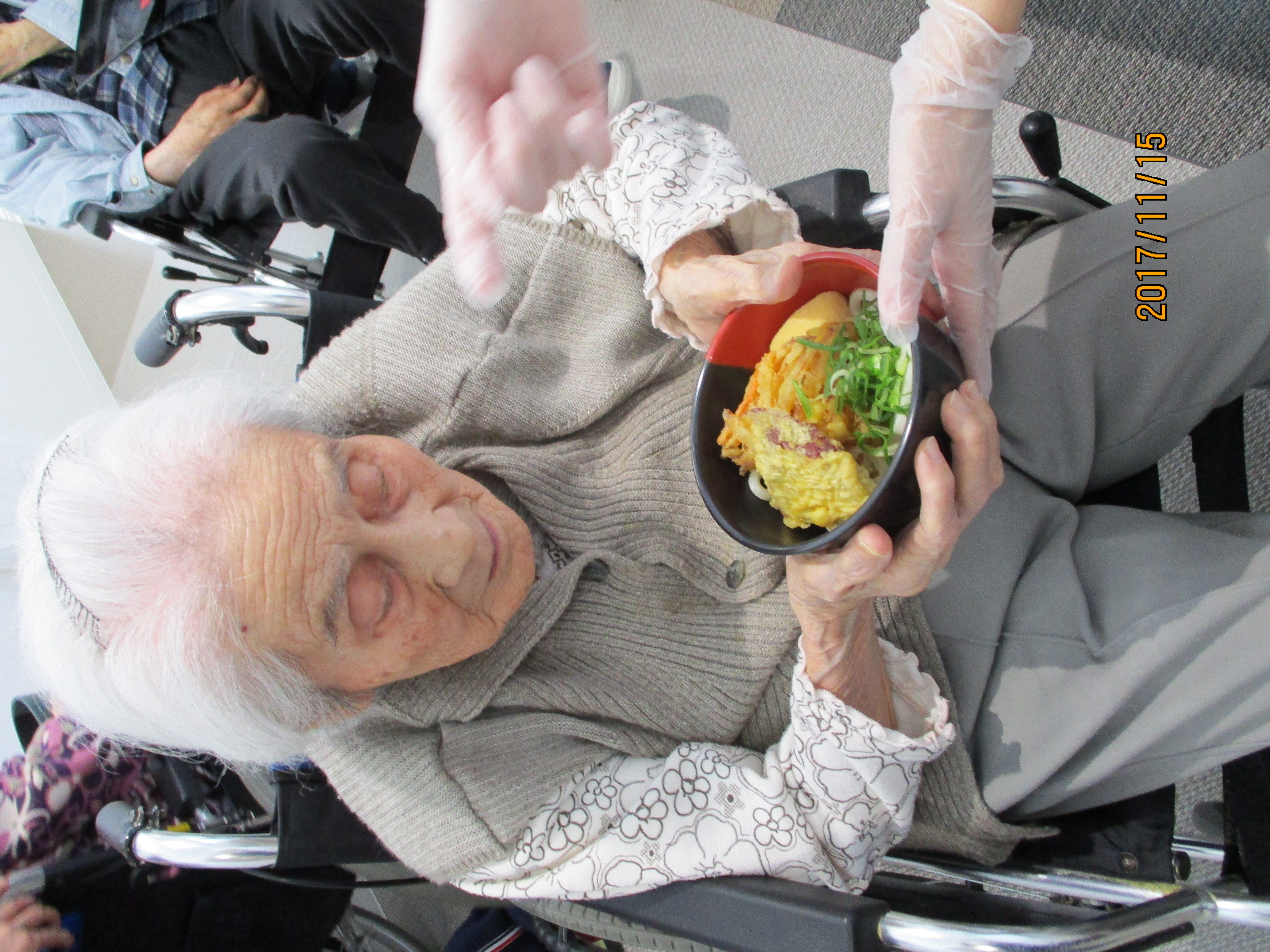 ご利用者様、ご家族様、職員みんなで、できたて手打ちうどんをいただきます。「こしがあっておいしいわね!」「天ぷらもおいしいね、おなかいっぱい」「また作りたいね」と大好評でした。