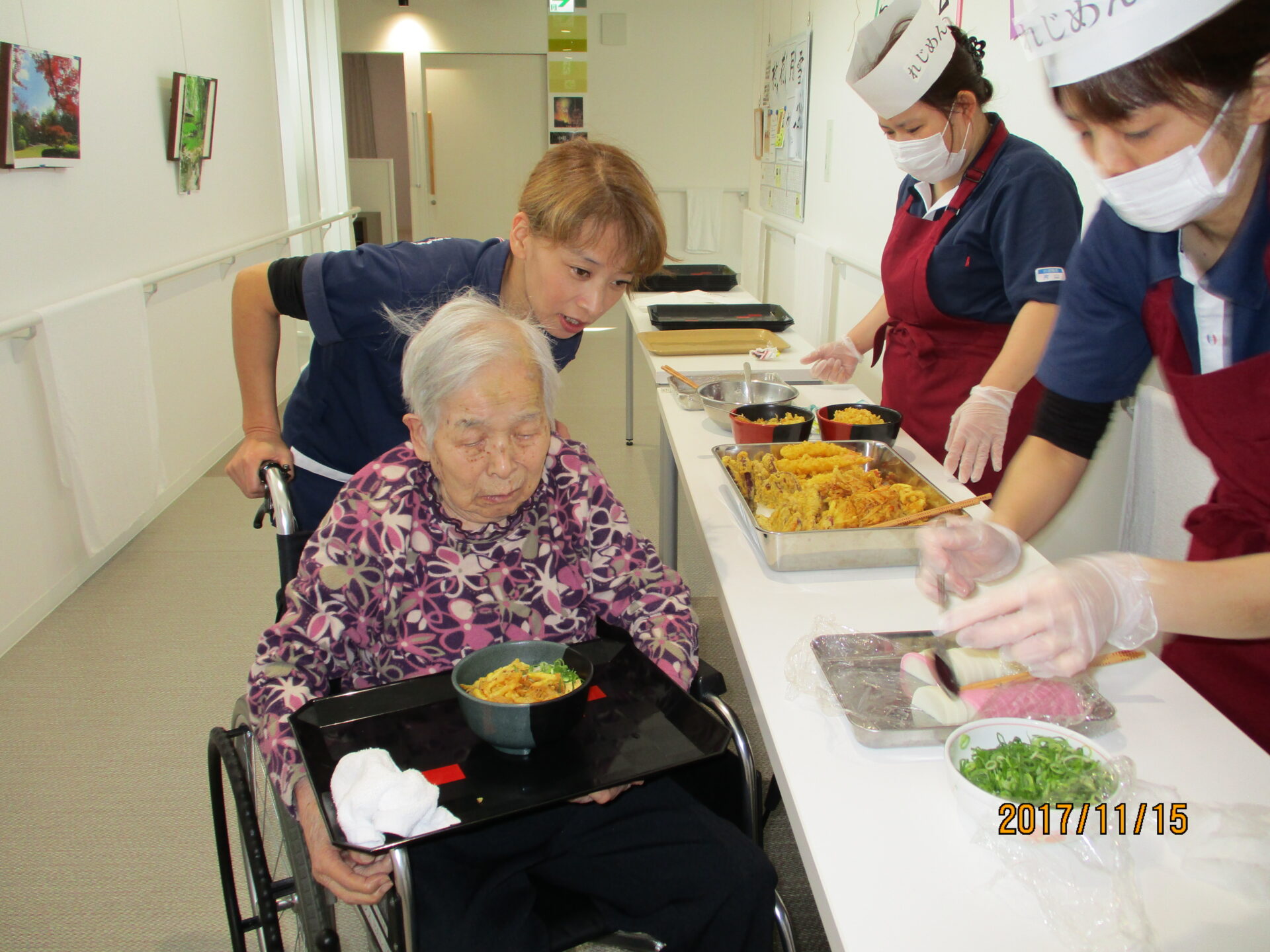11月15日昼食で、ご利用者様と一緒に「手打ちうどん」を作り、お好きな具を選んでトッピングしていただく「手打ちうどんパーティ」を開催しました。