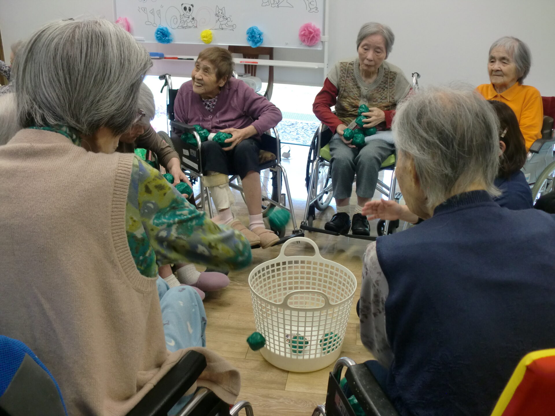 当施設では、天気の良い日は外へ出て散歩をしたり、リビングに集まってボール送りや体操をしたり、日頃から体を動かし機能維持できるよう取り組んでいます。
