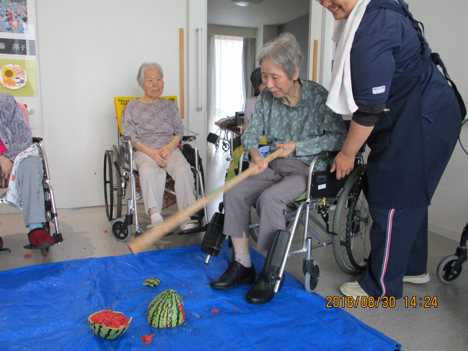 みなさんが協力し合い、何とかすいかを割る事ができました。