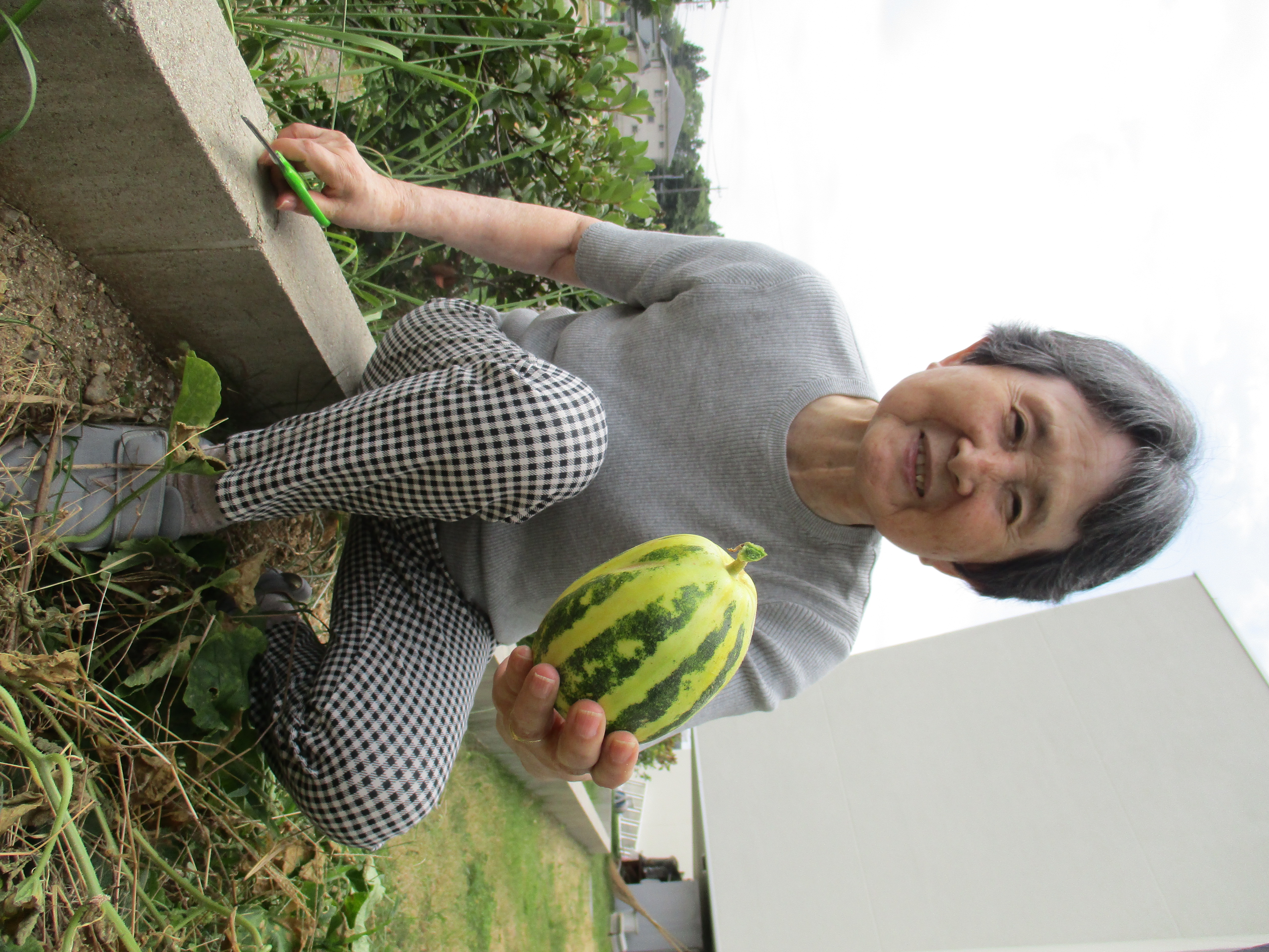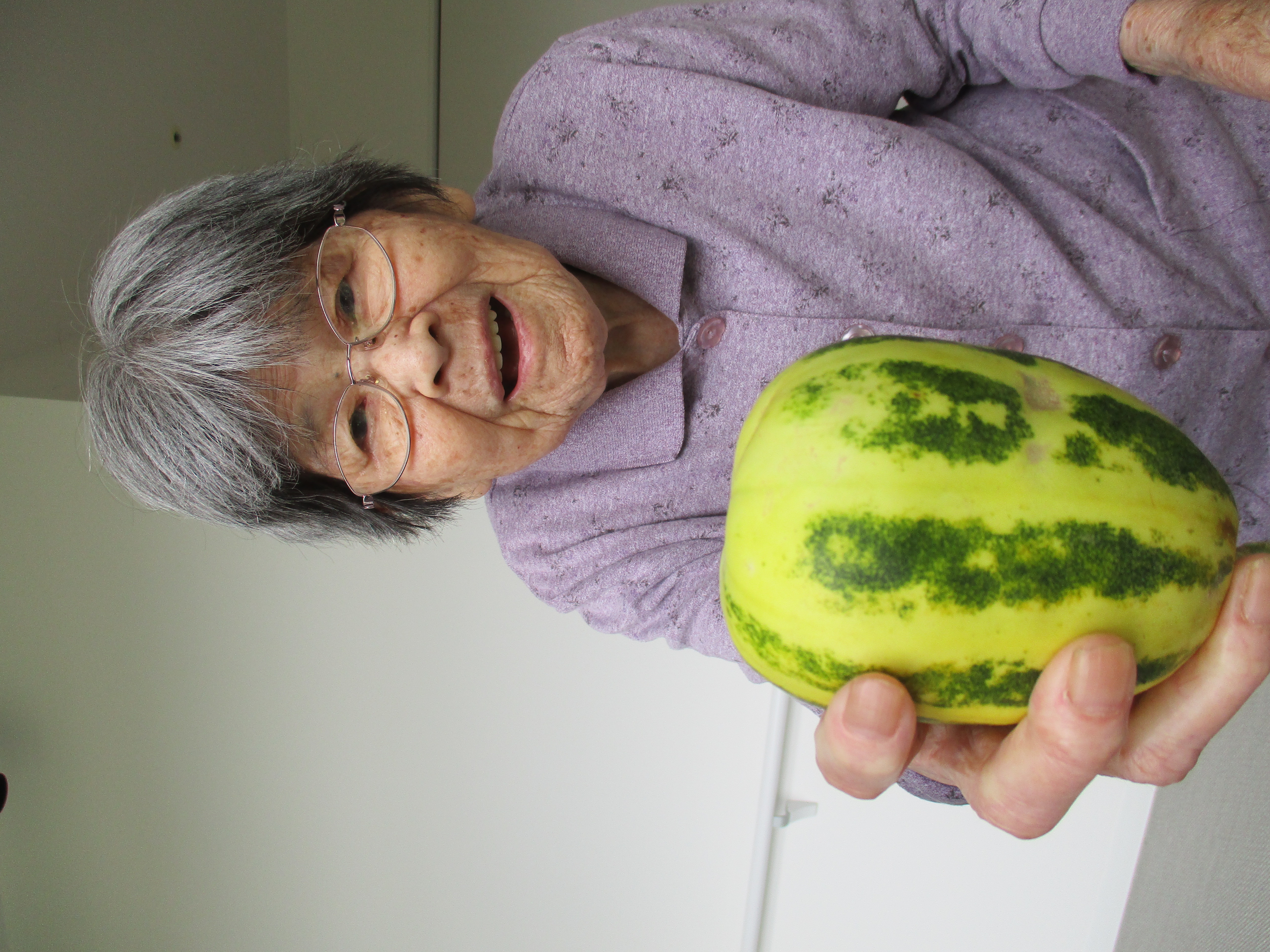 7月27日、今まで緑色だったタイガーメロンが黄色く実りました。台風が来る前にと、利用者様に収穫していただきました。
