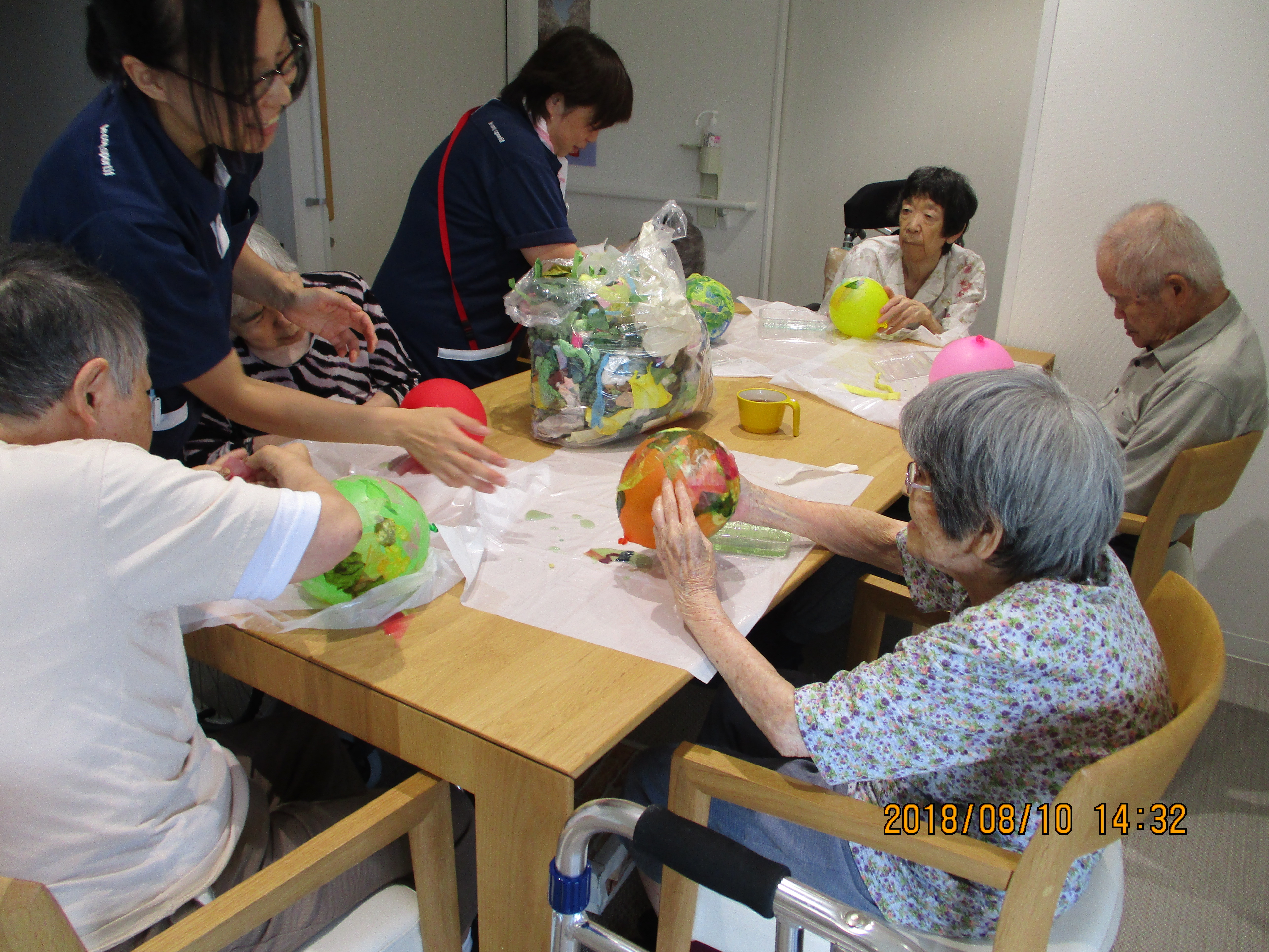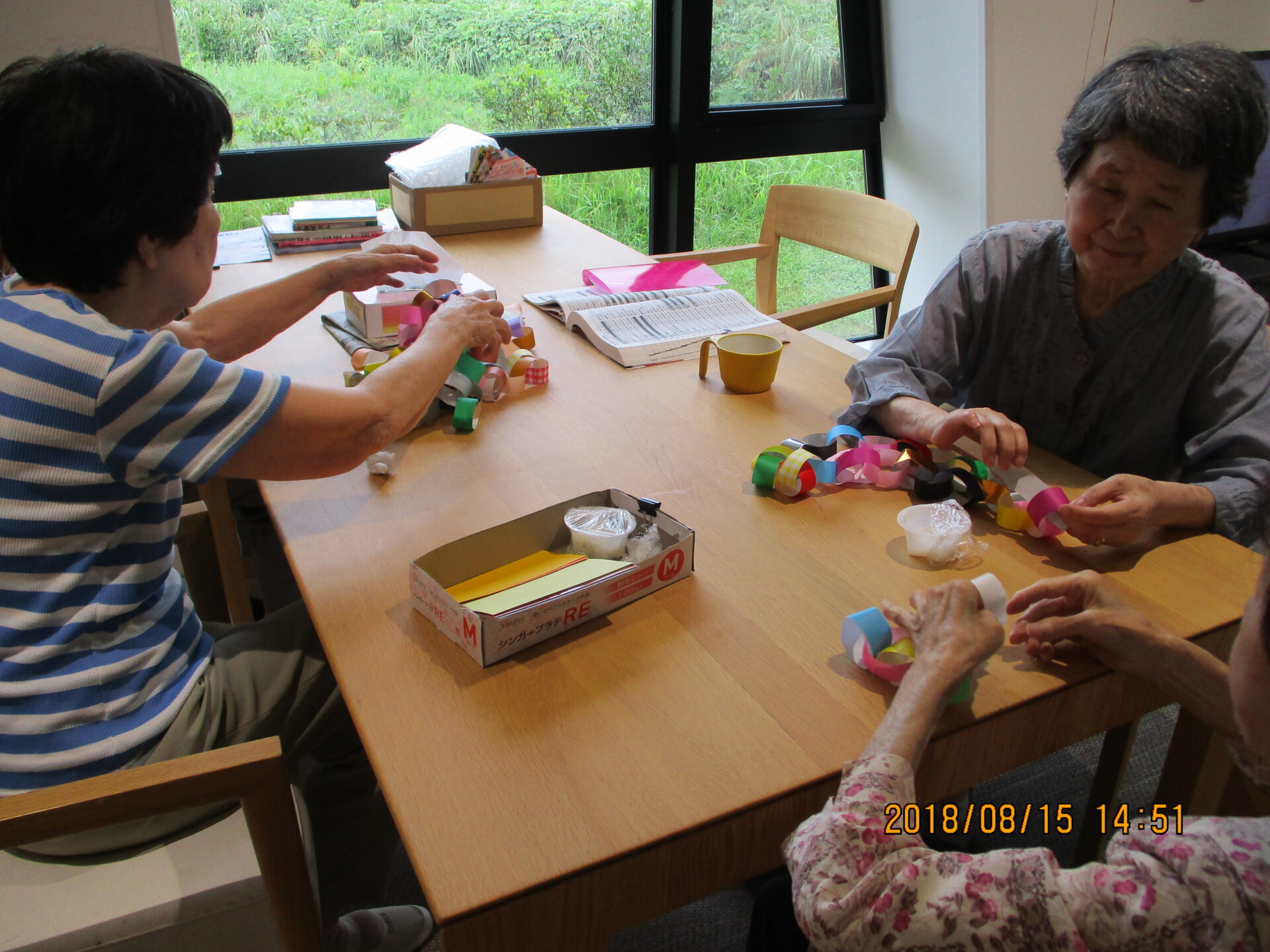 利用者さまにも、納涼祭にむけて一緒に飾り作りをしていただきました。