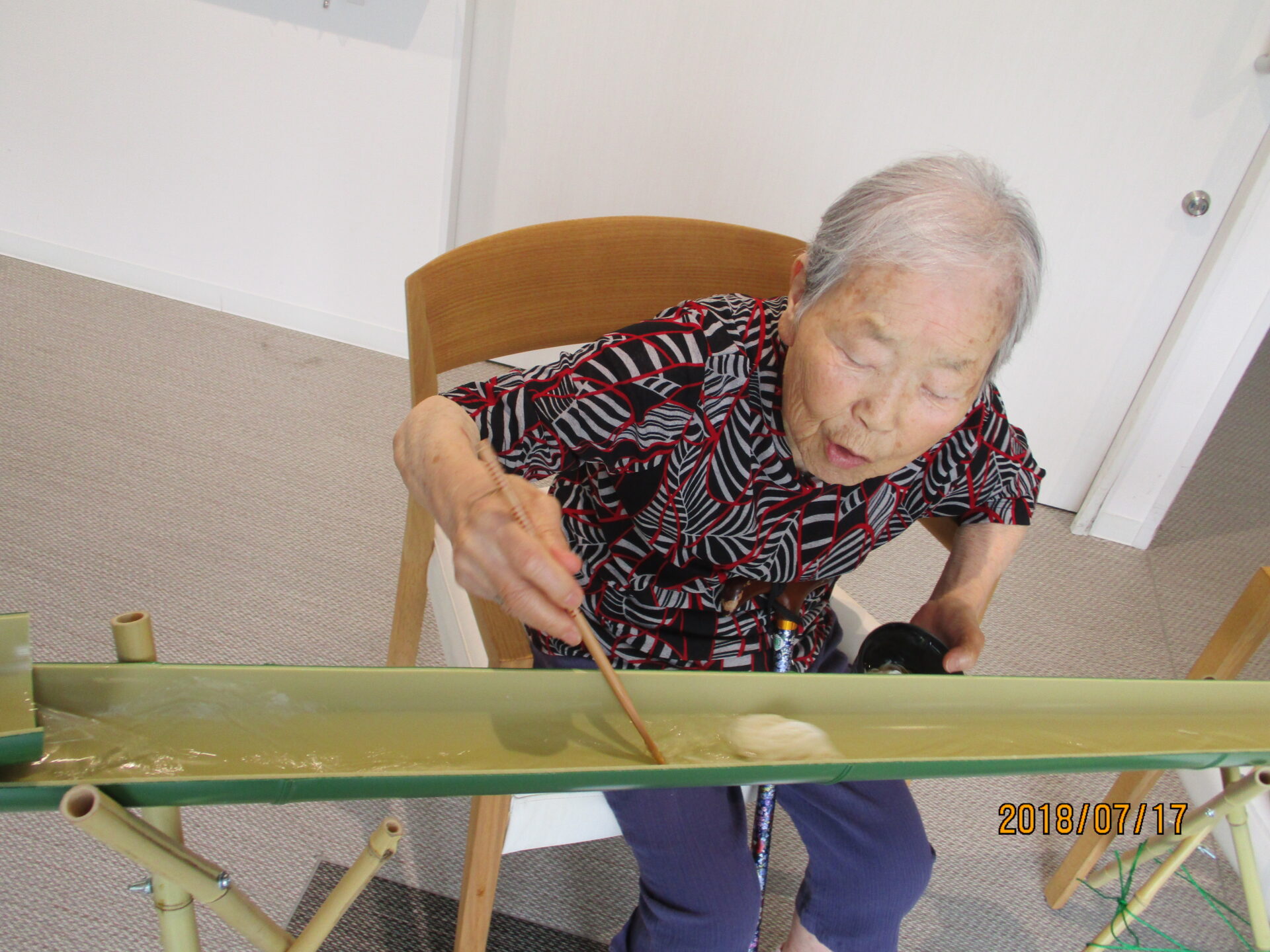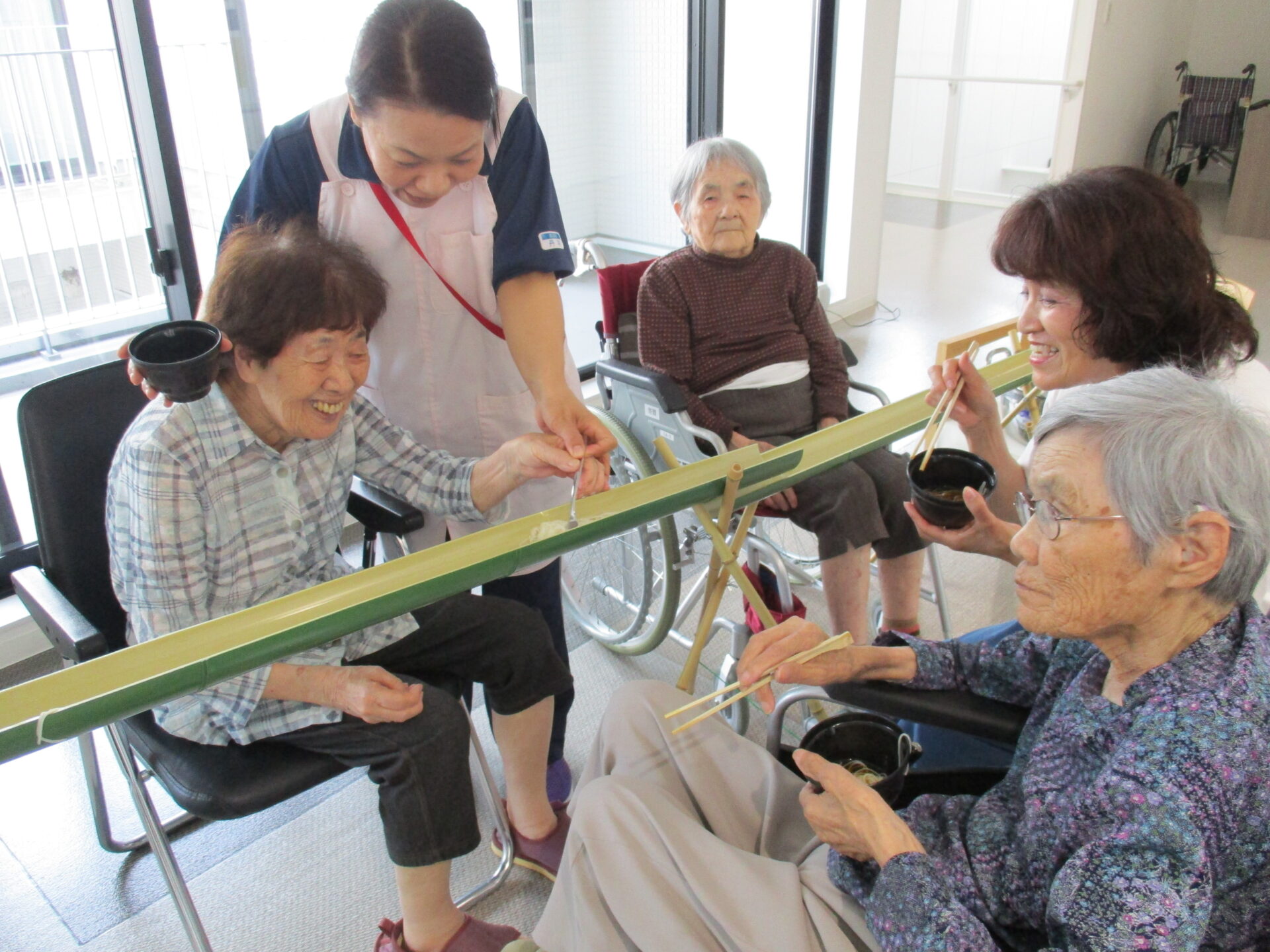 樋で流して、「わー、早い!もう1回流して!」「涼しくていいわね」「おいしいね」と、ご家族様にも参加していただき、皆様楽しい時間を過ごしていただきました。