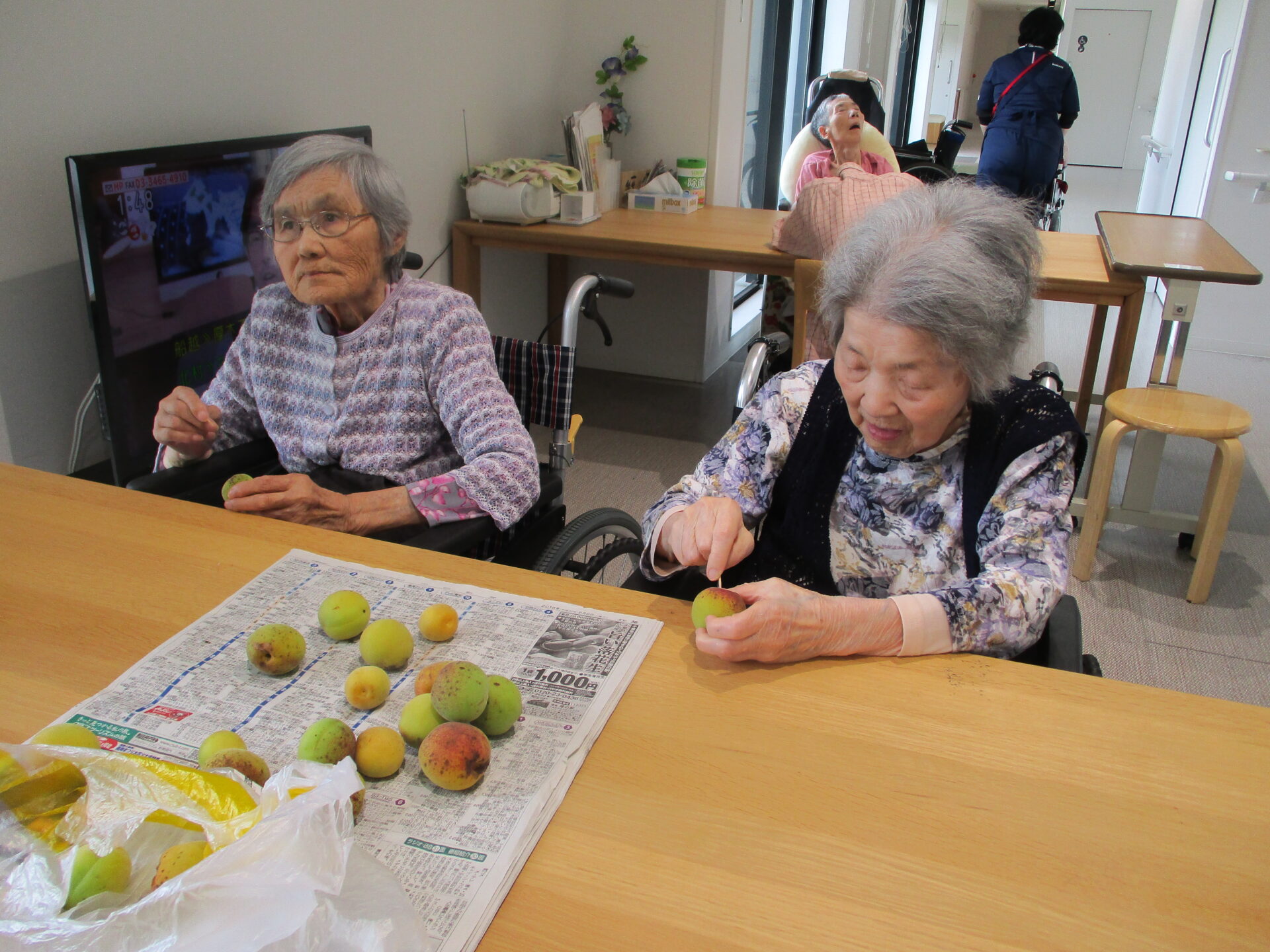 みなさんに、梅のへたを取って頂きます。