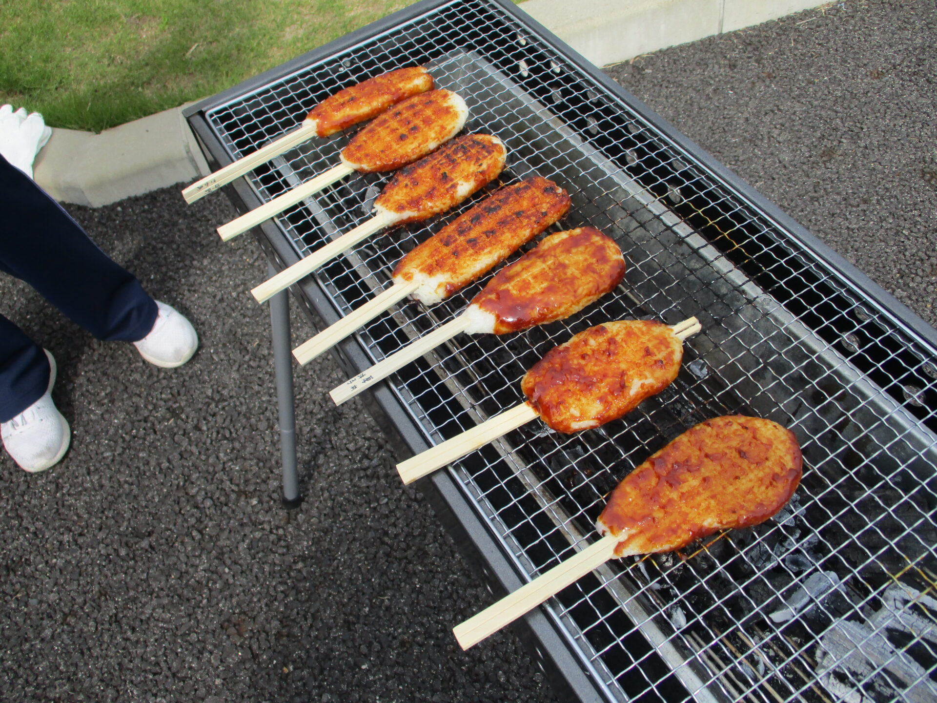 準備できた五平餅を玄関外に準備した炭火で焼きます。