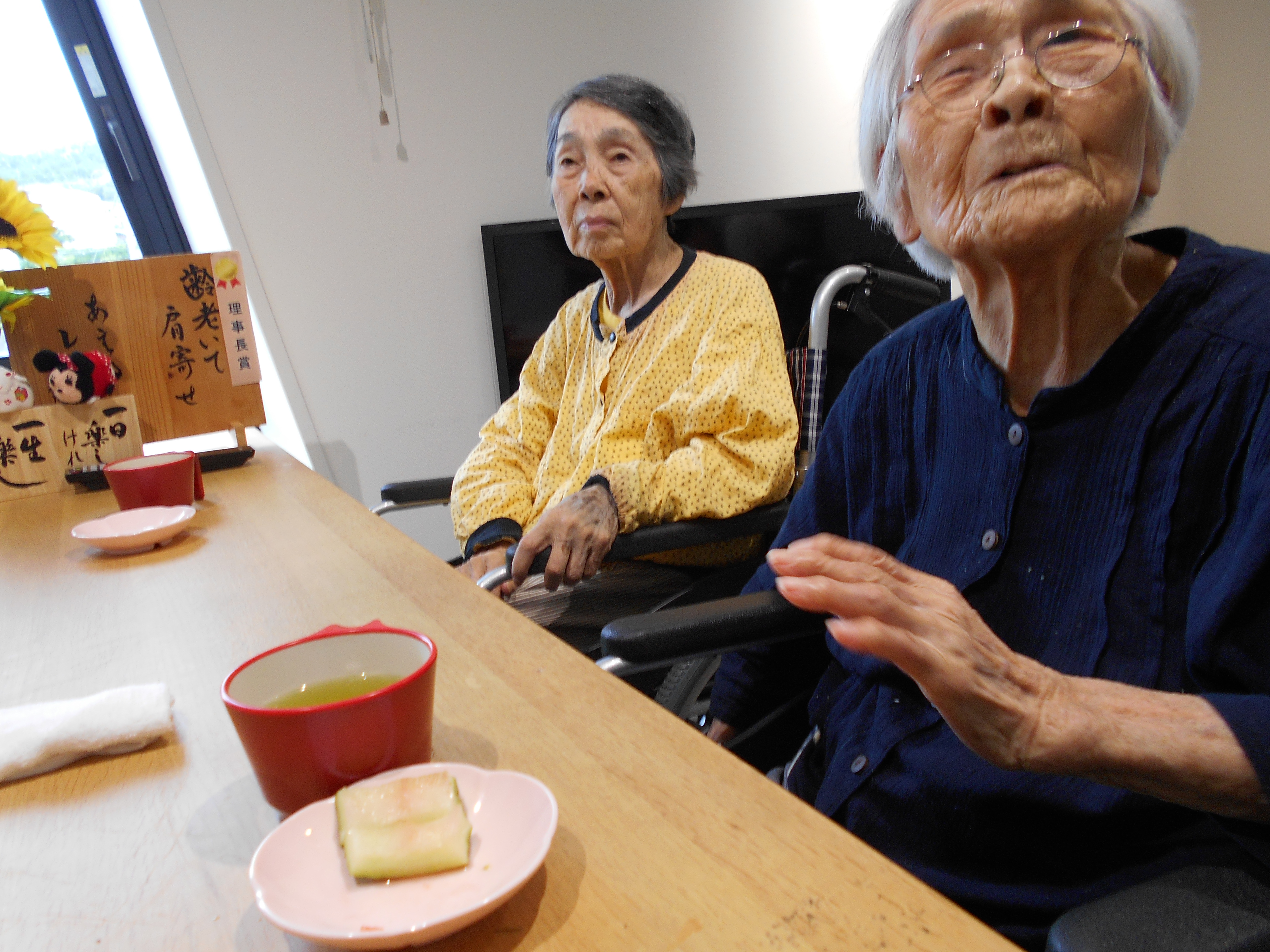 「お味はいかがですか?」と聞きに行くと、皆さますでに完食!!赤い部分はきれいになくなり、皮のみ残っていました。「甘くてとってもおいしかったわ」「本当ね、売ってるスイカよりおいしいわよ」と、笑顔で答えていただきました。