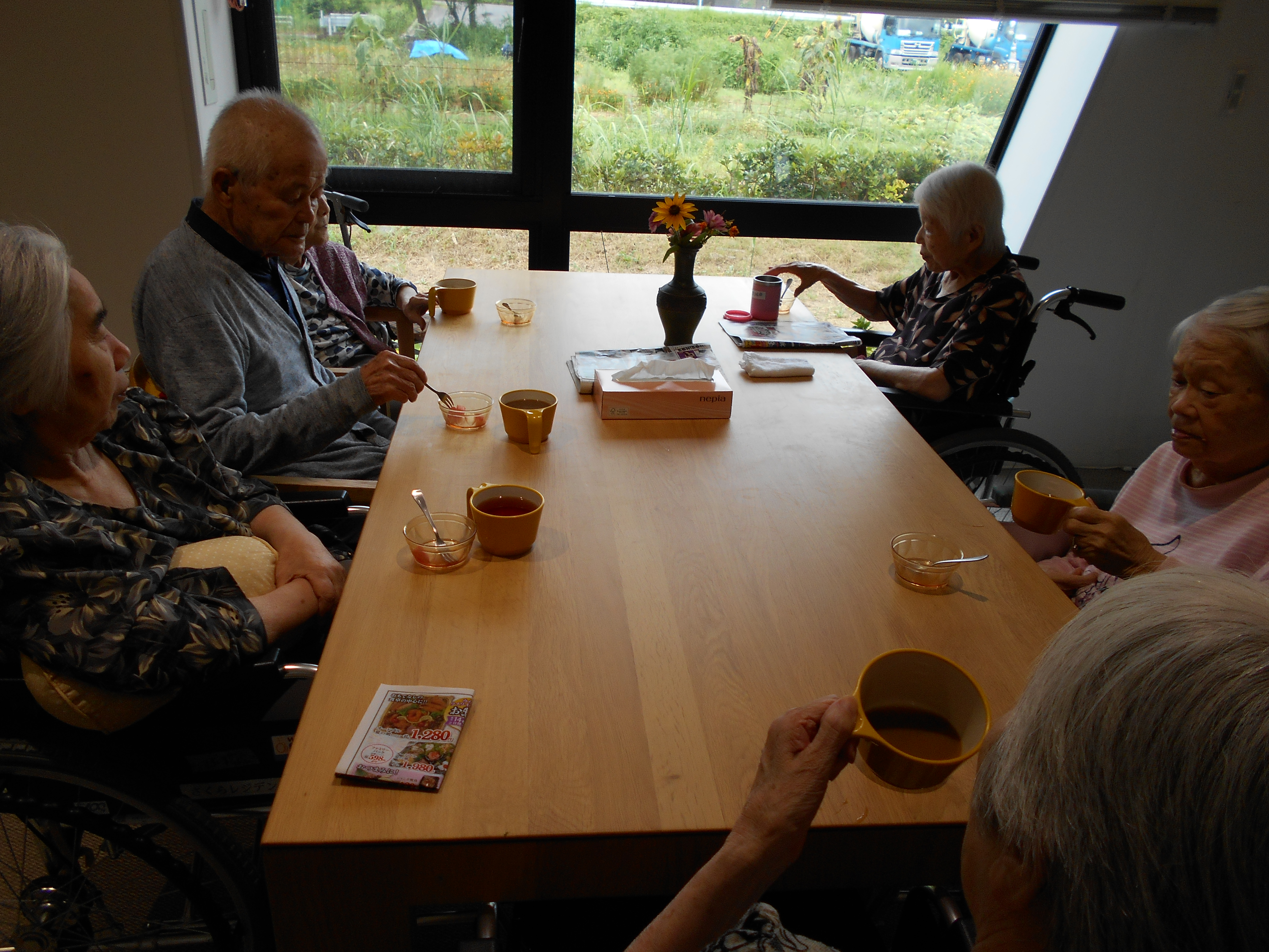 外のお花を眺め、スイカとお好きな飲み物をいただきながら、団欒のひと時です。