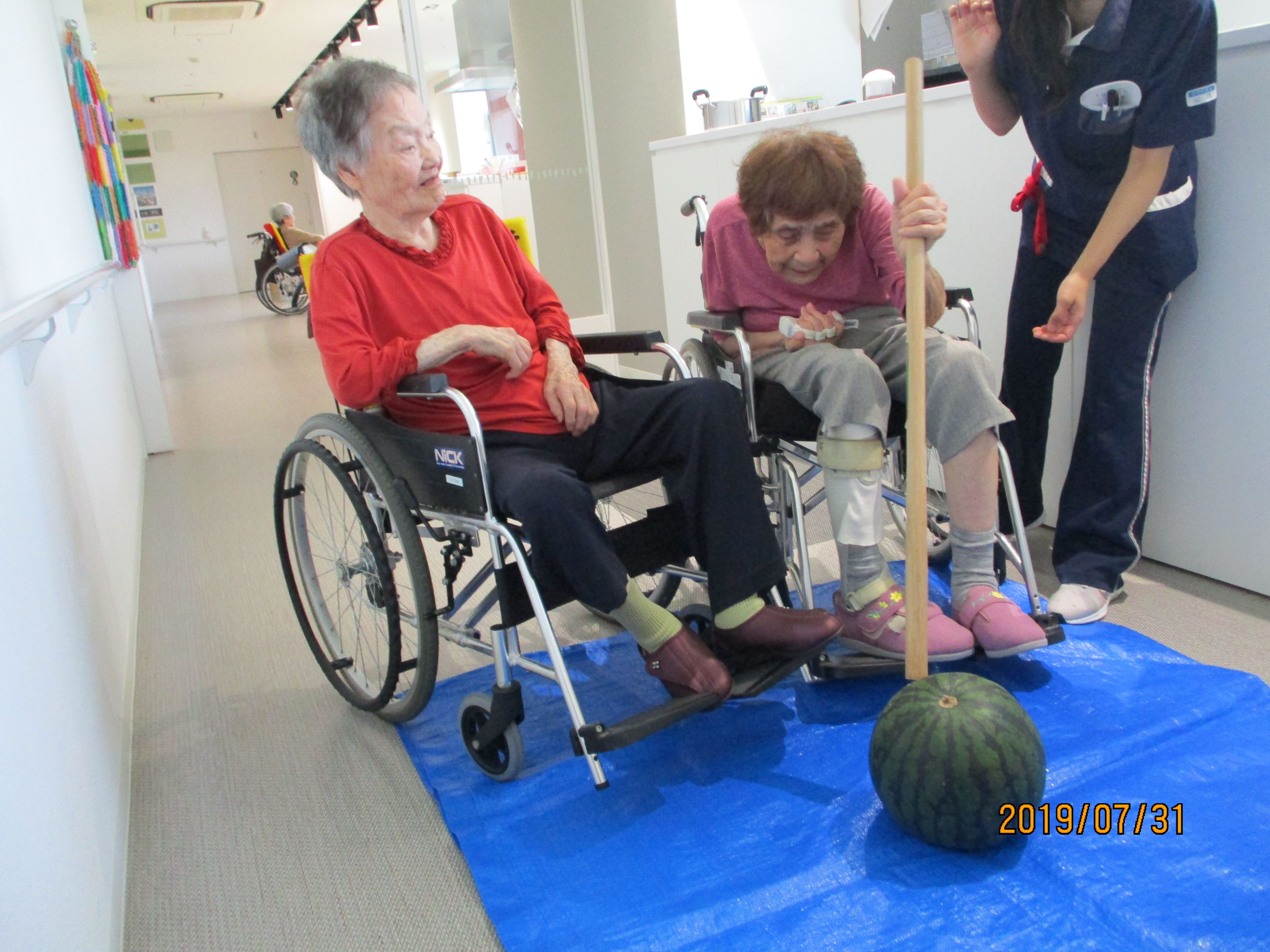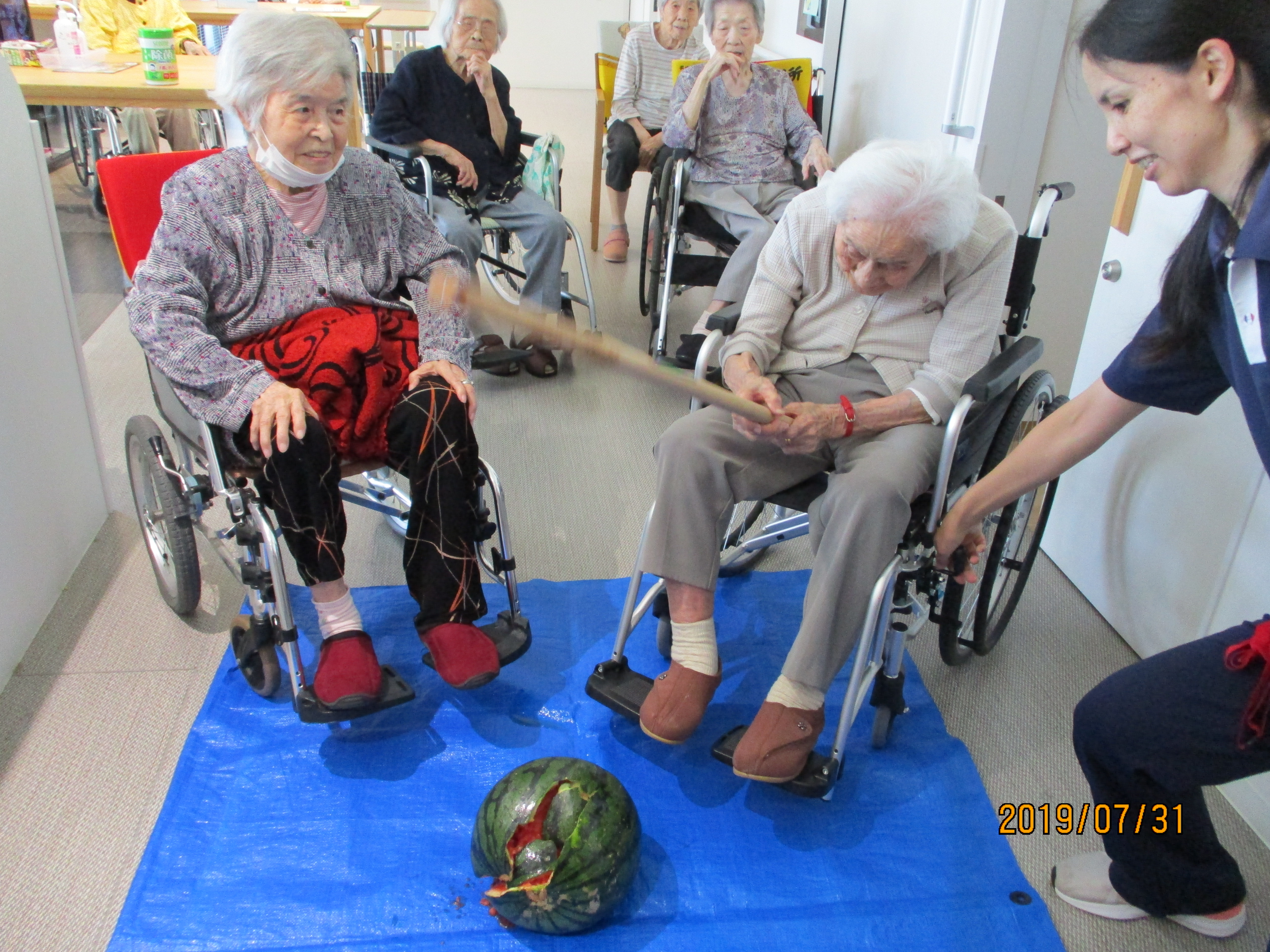 『すいか割り』と聞き、お部屋で休んでいた利用者様も「私も割りに行ってくるかなぁ」と共同スペースに出てきて参加されていました。