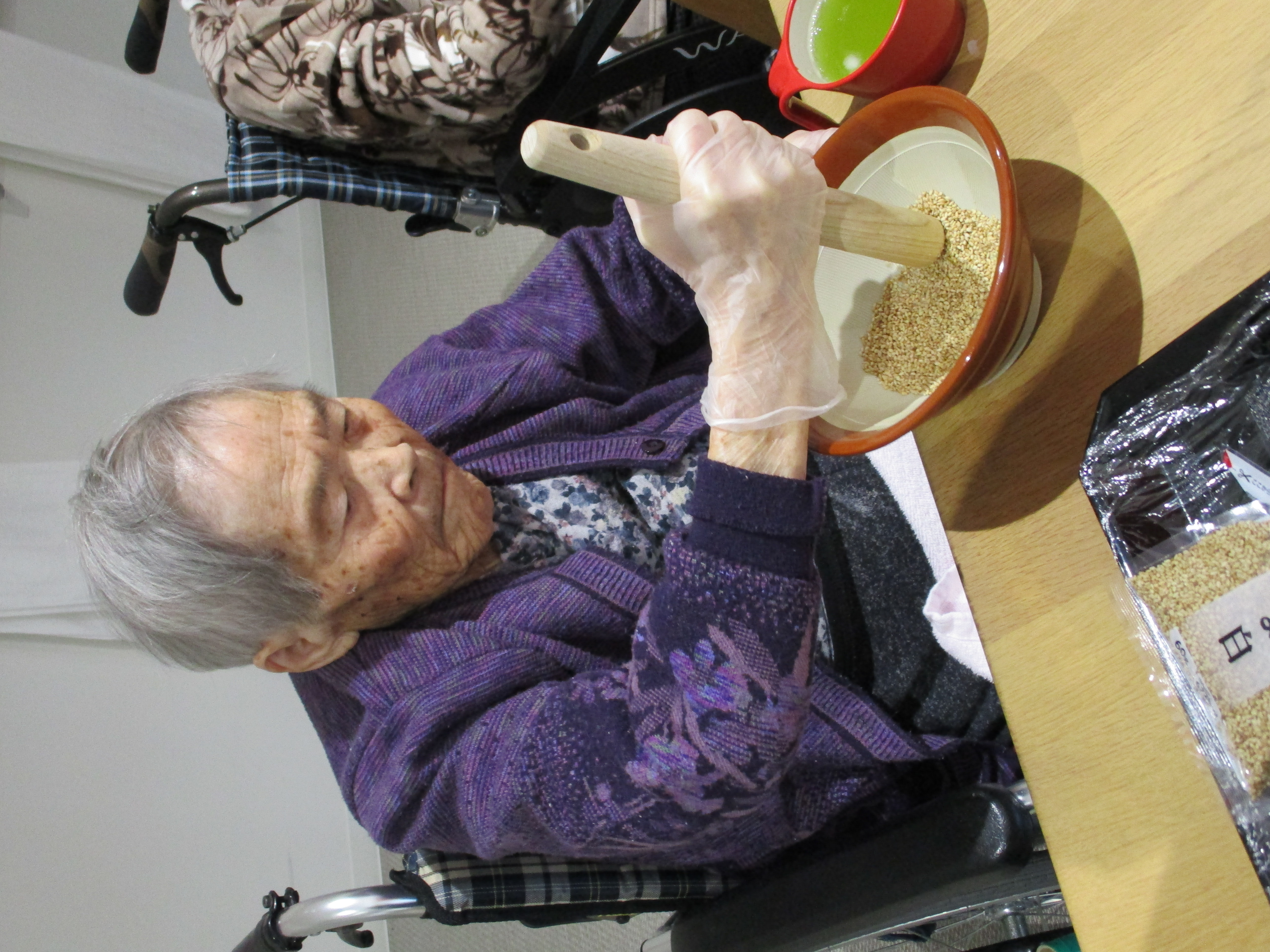 五平餅の味噌に入れるゴマをすり鉢ですります。