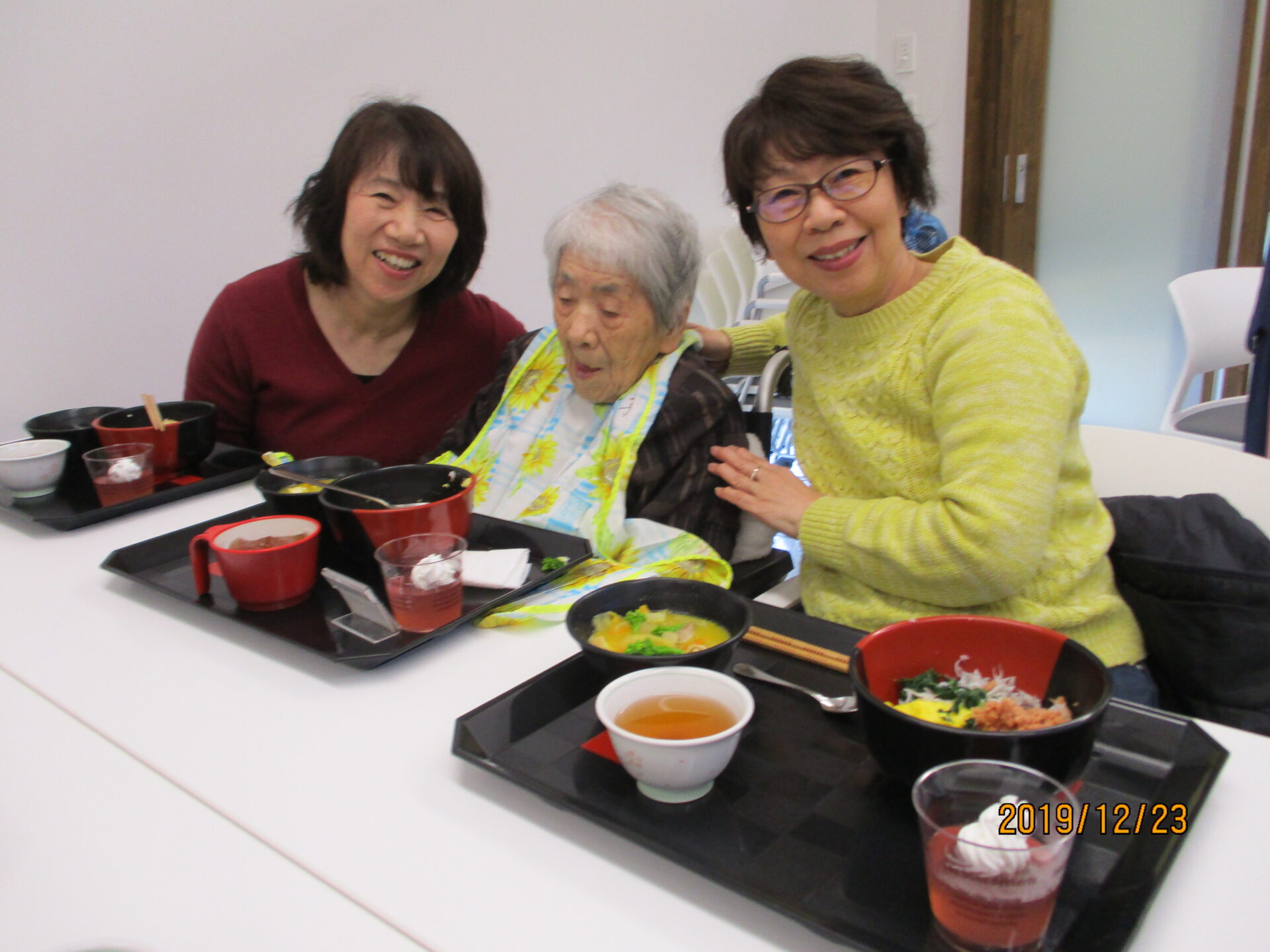 12月23日、2階特養フロアで忘年会を開催しました。メニューは、さくら庭園で収穫した野菜をたっぷり使った「豚汁」、「三色丼」、「ハーブティーゼリー」です。