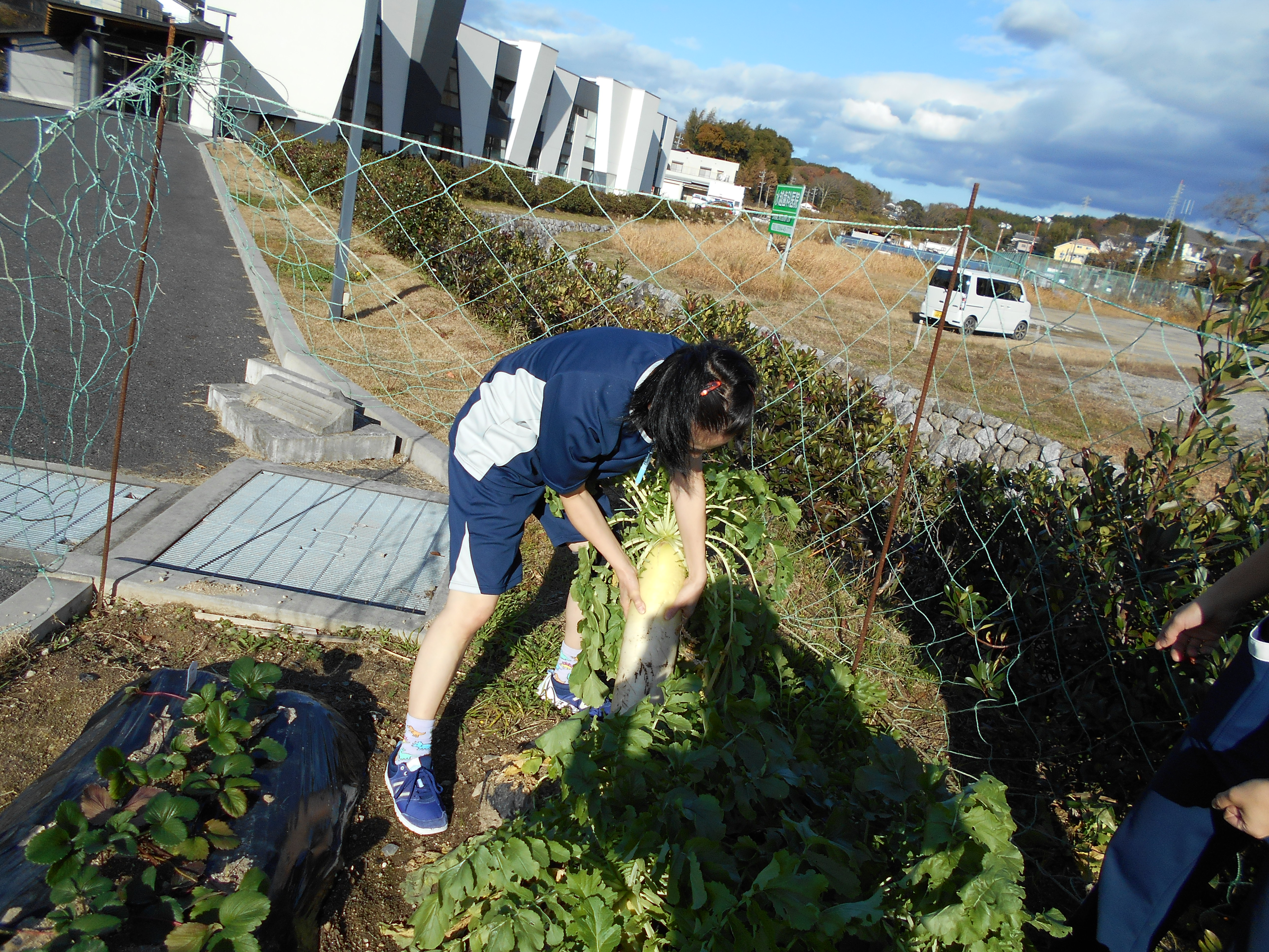 まずは、さくら庭園の大根と人参をみんなで収穫に行きます。立派な大きさに育っています。