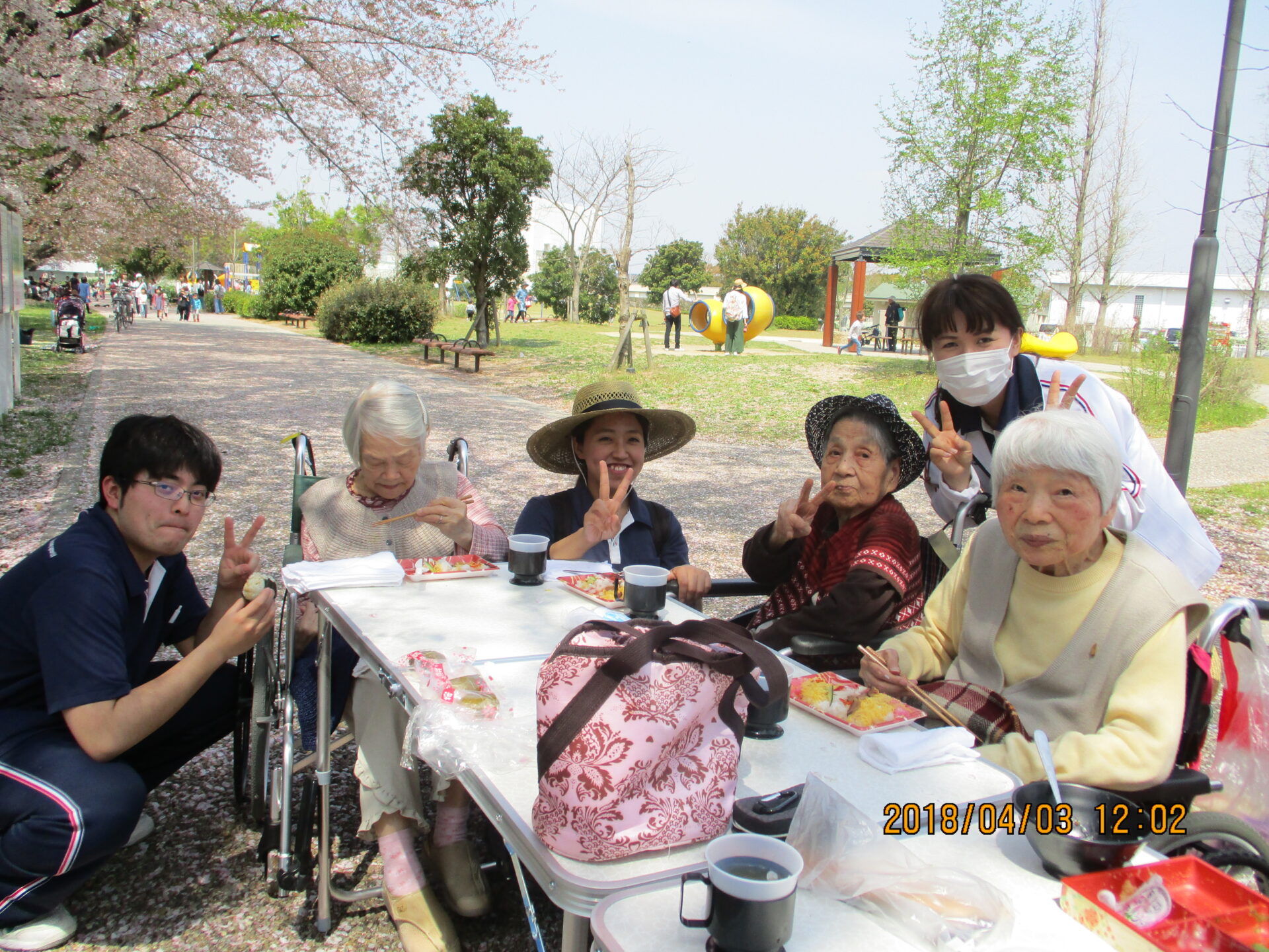 桜の花が舞い散る中、お花見弁当をいただきました。